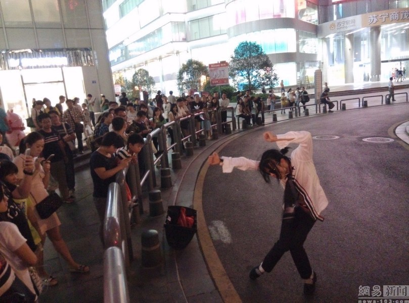 图为该男子在闹市跳舞。