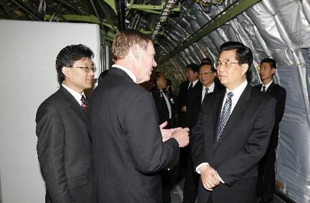 2006年4月19日,国家主席胡锦涛在西雅图波音公司参观。这是胡锦涛在一架正在组装的波音777型客机上听取波音公司总裁介绍情况。新华社记者 兰红光 摄