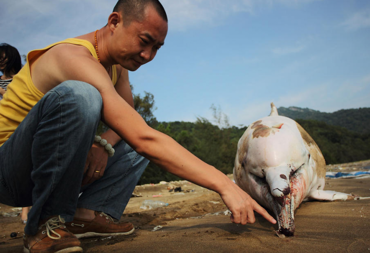 9月20日,深圳,一头伤痕累累的中华白海豚被发现搁浅在内伶仃岛南湾海滩上,身上有多处被割伤的痕迹,随后死亡。
