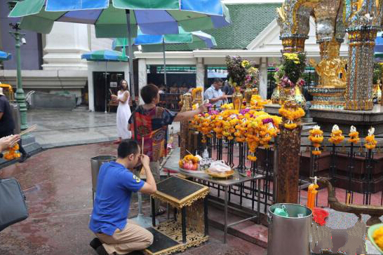 资料图:9月17日清晨,不断有游客与朝拜者前往参观曼谷四面佛。