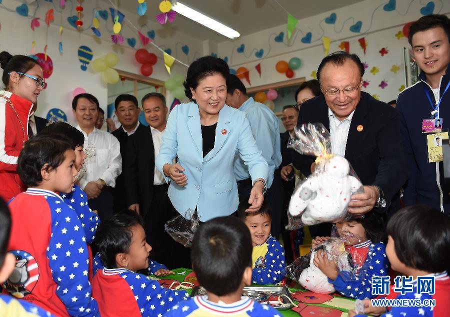 9月27日,中共中央政治局委员、国务院副总理、中央代表团副团长刘延东率中央代表团分团,带着党中央、国务院的亲切关怀和全国各族人民的深切情谊,来到和田地区、阿克苏地区慰问各族干部群众,并祝贺大家中秋节快乐。这是刘延东在阿克苏市“双语”幼儿园与孩子们在一起。新华社记者 张领 摄