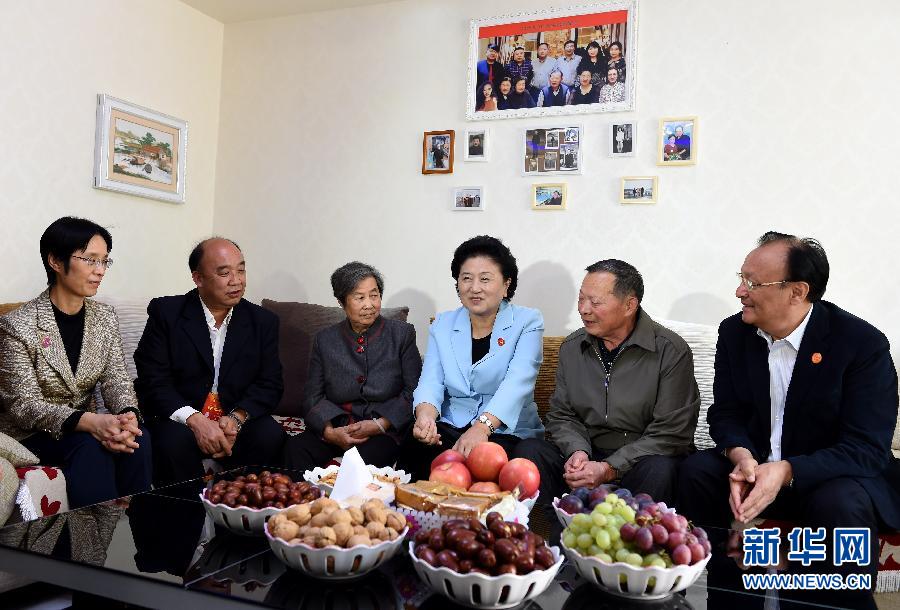 9月27日,中共中央政治局委员、国务院副总理、中央代表团副团长刘延东率中央代表团分团,带着党中央、国务院的亲切关怀和全国各族人民的深切情谊,来到和田地区、阿克苏地区慰问各族干部群众,并祝贺大家中秋节快乐。这是刘延东来到新疆生产建设兵团第一师五团团场退休职工包春祥家中慰问。新华社记者 张领 摄