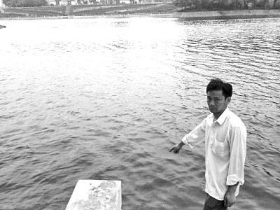 刘洁的父亲刘德俊指着女儿落水的地方资料图