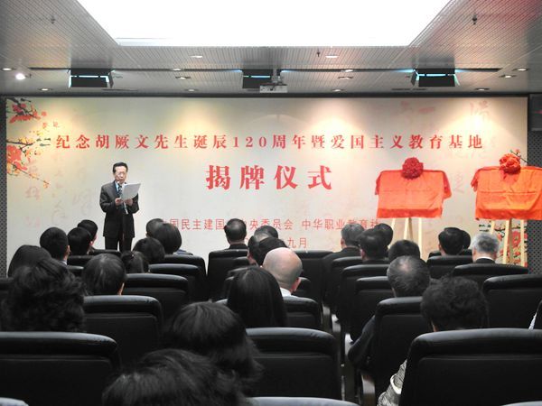 9月29日上午,纪念胡厥文诞辰120周年暨民建中央爱国主义教育基地胡厥文同志生平事迹展览馆揭牌仪式在上海隆重举行。全国人大常委会副委员长、民建中央主席陈昌智出席发表重要讲话,并与中共上海市委统战部副部长虞丽娟共同为“爱国主义教育基地”揭牌。全国政协副秘书长、民建中央副主席宋海宣读了《民建中央关于命名胡厥文同志生平事迹展览馆为爱国主义教育基地的决定》。上海市政协副主席、民建中央副主席、民建上海市委主委周汉民主持揭牌仪式。
