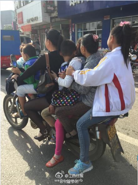 【一车载7人 都昌马路上演摩托车“叠罗汉”】 :9月27日,网友在都昌县大转盘四小路段见到惊险一幕。一女子骑着二轮摩托车载着一家老小共7人行驶在路上。只见其摩托车油箱上趴着2个孩子,后座挤着3个小孩一个老人,坐在车最后面的小女生仅有半个屁股落在货物架上,看着让人担心。