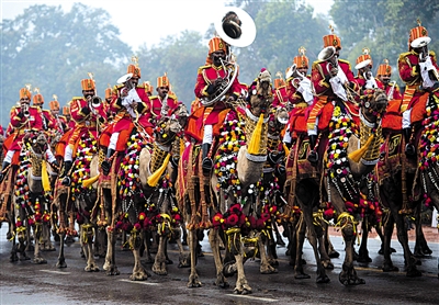 印度士兵骑着盛装打扮的骆驼接受检阅。
