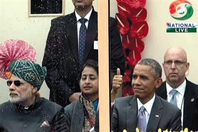 奥巴马观看印度阅兵时,为摩托车表演“点赞”。