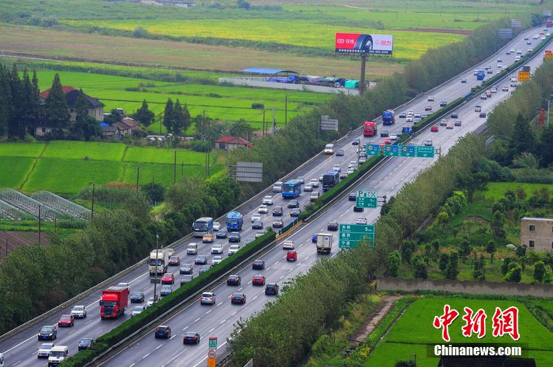 10月1日,江苏苏州,国庆长假高速公路免费通行第一天,进出上海的车辆从沿江高速上海嘉定段经过。计海新 摄