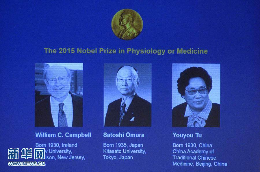 10月5日,在瑞典首都斯德哥尔摩,诺贝尔委员会在新闻发布会上展示中国科学家屠呦呦(右)、日本科学家大村智(中)和爱尔兰科学家威廉·坎贝尔的肖像照片。