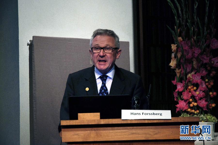 10月5日,在瑞典首都斯德哥尔摩的卡罗琳医学院“诺贝尔大厅”,诺贝尔奖评委会成员汉斯讲解获奖者的科研成果。