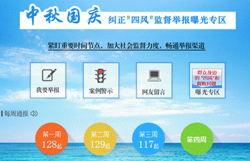 9月6日,中央纪委监察部网站推出《中秋国庆纠正“四风”监督举报曝光专区》。据统计,截至9月30日,该专区中的“每周通报”栏目共曝光了三批374起违反中央八项规定问题。9月16日起,中纪委网站开设的《“四风”监督哨》专栏也陆续发布了一批违反中央八项规定精神典型问题,既点名道姓通报曝光,又披露查处过程,分析教训原因。截至9月底,共通报剖析11起违纪案例。