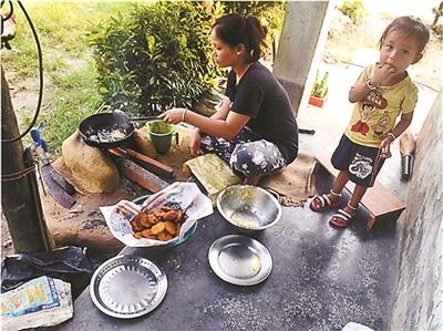 10月4日,一名尼泊尔妇女由于缺乏燃气,只能用柴火做饭 新华/法新