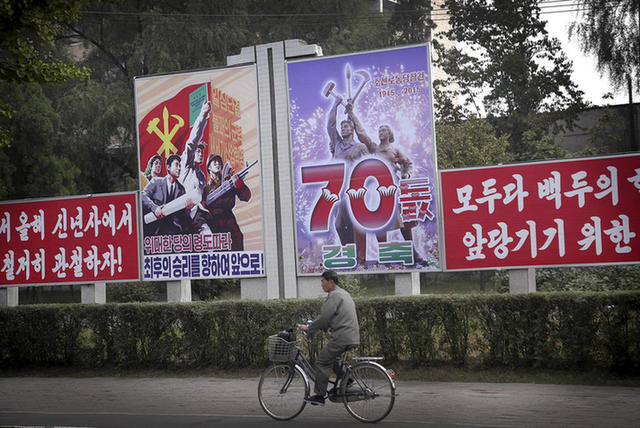 当地时间2015年10月8日,朝鲜平壤,民众正在为即将到来的朝鲜劳动党成立70周年庆典做准备。