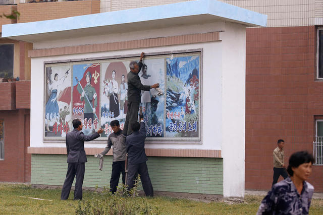 当地时间2015年10月8日,朝鲜平壤,民众正在为即将到来的朝鲜劳动党成立70周年庆典做准备。