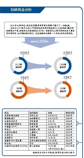 一项对全国12城市40余家三甲医院临床用药情况的抽样调查显示,国家和地方增补的基本药有500多种,短缺的已高达342种。