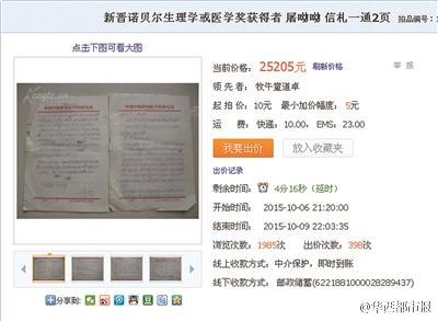 屠呦呦书信正式撤拍 卖家:愿归还或捐赠给相关机构