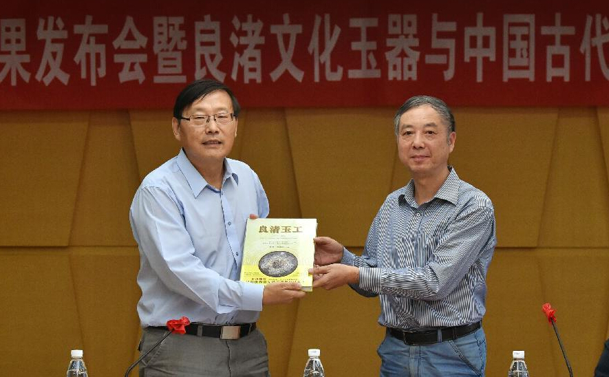 浙江大学文化遗产研究院院长曹锦炎教授(右)将《良渚玉工》一书交付到中国社会科学院考古研究所所长王巍研究员手中。