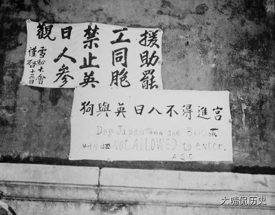 1925年,五卅运动中,为了抗议英日残杀中国同胞,北京市民在故宫的宫墙上贴出“狗与英日人不得进宫”的标语。