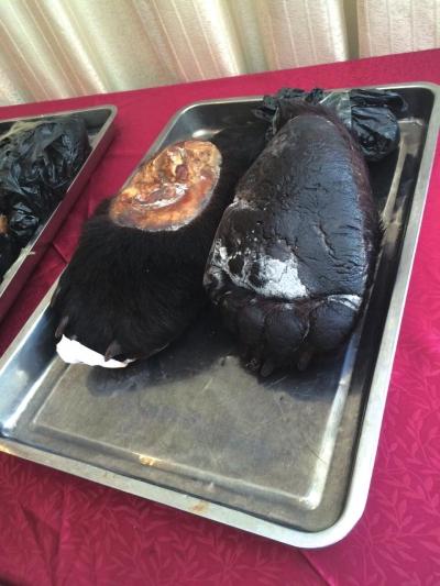 据了解,在现场托盘里的一只只熊掌,也是硬生生从熊身上截取下来的,森森白骨可见。和象牙一样,砍断熊掌的前一步骤,也必是先害其命。