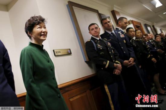 资料图:韩国总统朴槿惠访美,在五角大楼内与韩裔及美国的服役军人交谈。