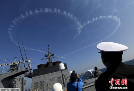 当地时间10月18日,日本海上自卫队在相模湾正式举行“观舰式”。图为日本自卫队“蓝色脉冲”飞行表演队进行表演。