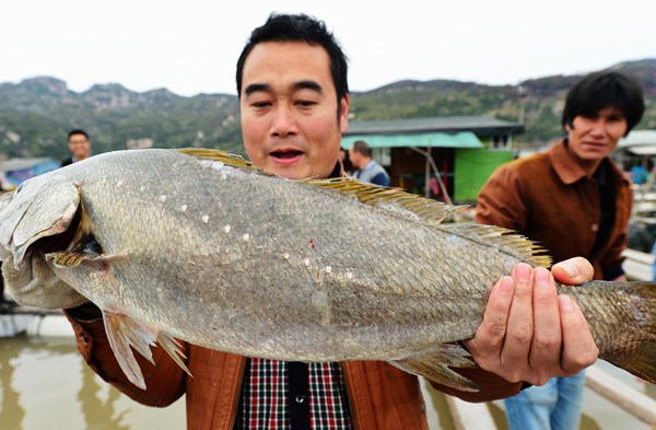 宁德市福安市下白石镇下岐村干部展示养殖鱼排里近9斤的海鱼。
