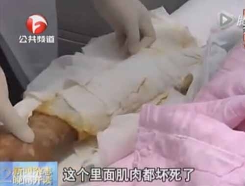 医生:这个里面都没有肉了,这个伤的比较重,里面的肌肉都坏死了。