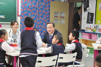 2013年12月,卡梅伦在成都龙江路小学分校参观访问。(资料图片)