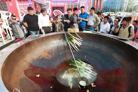 2015年10月17日,河南郑州,美食节期间上演“百鱼宴”,一个直径3.15米,深0.7米,可容纳3吨高汤的巨锅煮百斤大鱼供数百人分享?;肺莱瞪纤鹬鼗跗?61.2斤鱼王下锅,吸引众多市民围观品尝。