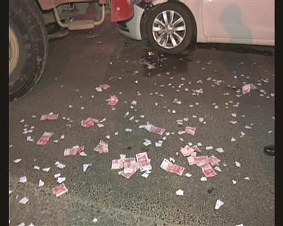 记者赶到现场时,两辆车还在国道路口停留,白色轿车的车头已经被压扁。两辆车周围一片狼藉,都是钞票的残片。