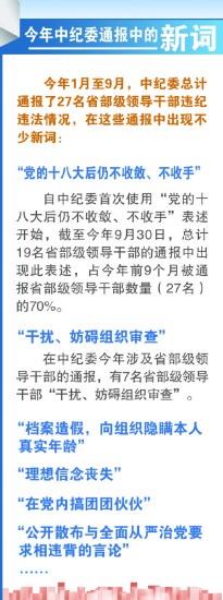 这些表述都出自中纪委的通报。今年1月至9月,中纪委总计通报了27名省部级领导干部,梳理通报文字可以看到,既有一些普遍化表述,也有一些个性化语言,而诸多个性化语言随后也成为了普遍表述。