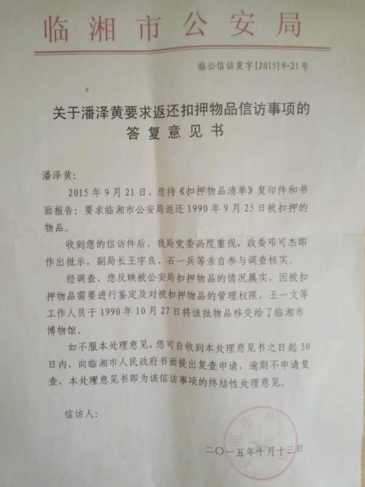 临湘市公安局副局长王宇良10月17日回应记者称,当年潘泽黄藏品被扣押可能涉及倒卖文物,因其藏品中有一件玉笔筒是列入国家三级保护的。当时警方将藏品移交博物馆后,未对事情进行调查处理。现在藏品属于博物馆,不予归还个人。