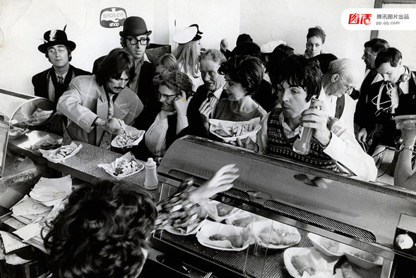 作为英国音乐史上最著名的摇滚乐队,披头士四个成员都很爱吃炸鱼薯条。图为1967年10月,披头士乐队成员在一家炸鱼薯条店用餐。
