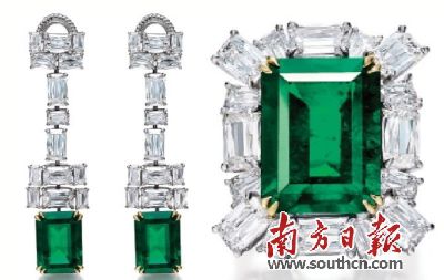 哥伦比亚祖母绿配钻石耳环及戒指。保利香港供图