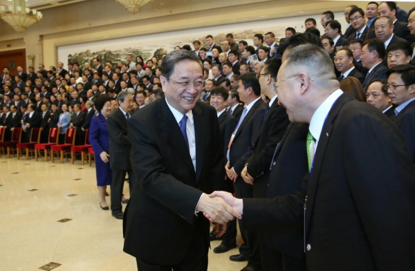 10月19日至20日,中国光彩事业促进会第五次会员代表大会暨五届一次理事会在北京召开。这是10月19日,中共中央政治局常委、全国政协主席俞正声会见全体代表。   新华社记者 刘卫兵 摄