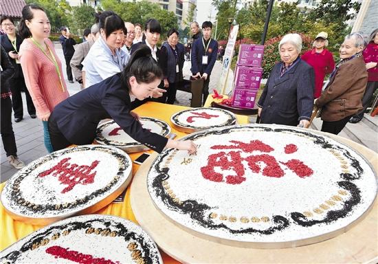 10月20日,义乌市怡乐新村的老人们,围着5个巨型重阳糕啧啧称奇。这是由义乌某国药馆专为他们定制的。吕斌摄