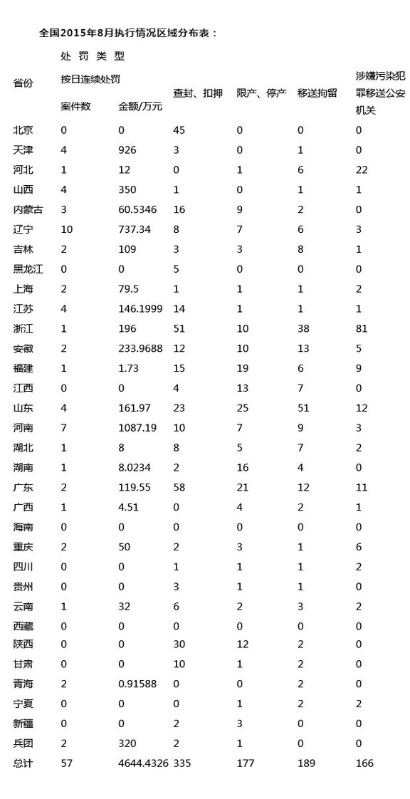 环境?;げ炕肪臣嗖炀志殖ぷ奘酌窠樯芩?,8月,全国范围内实施按日连续处罚案件共57件,??钍畲?644.43万元;实施查封、扣押案件共335件;实施限产、停产案件共177件;移送行政拘留共189起,移送涉嫌环境污染犯罪案件共166件。与7月情况相比,适用按日连续处罚案件数量基本持平,适用查封扣押案件数上升31%,适用移送涉嫌环境污染犯罪的案件上升34%,适用移送拘留案件数上升29%,限产、停产案件数下降30%。