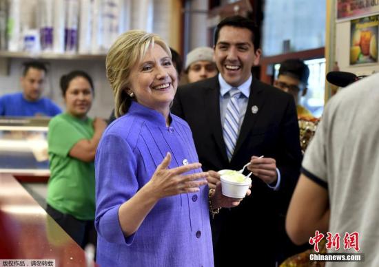 当地时间2015年10月14日,美国拉斯维加斯,美国总统候选人希拉里造访当地一个冰激凌店,在州议员Nelson Araujo陪同下吃冰激凌。