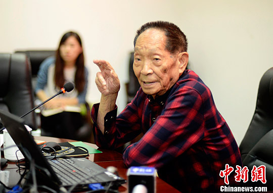 10月26日,在湖南杂交水稻研究中心,“杂交水稻之父”、中国工程院院士袁隆平正在向到访的海上丝绸之路主流媒体湖湘行记者分享杂交稻攻关的最新成果。中新社记者 杨华峰 摄