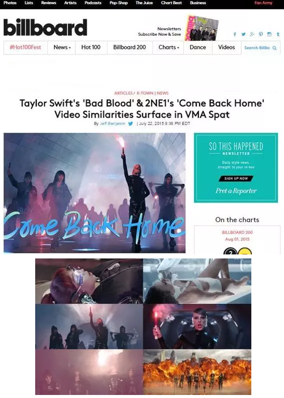 Taylor Swift的《Bad Blood》曾被指抄袭2NE1《Come Bake Home》的部分MV拍摄场景。歌手们在火花中前进、女战士们朝着镜头慢慢走近、打破窗户的场景以及城市全景、慢镜头处理都有异曲同工的地方。