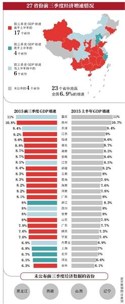 新京报讯 截至昨日,全国已有27个省份发布了前三季度经济运行情况,吉林省以6.3%的经济增速暂时“垫底”。目前增速最高的为重庆市,前三季度GDP同比增长11%。