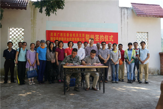 活动期间举行了民革广西区委会机关支部和隆安县世隆农业投资有限公司帮扶签约仪式。仪式结束后,民革专家到公司开发的鸭胆子种植基地进行实地调研和技术指导,并向公司捐赠两万元帮扶资金。此次扶贫日就精准扶贫攻坚的签约,进一步创新党派扶贫机制,融合机关、企业、市场的资源优势,增强贫困点“造血”功能,对上孟村早日脱贫,群众致富打下坚实基础。(冯敬鸿)