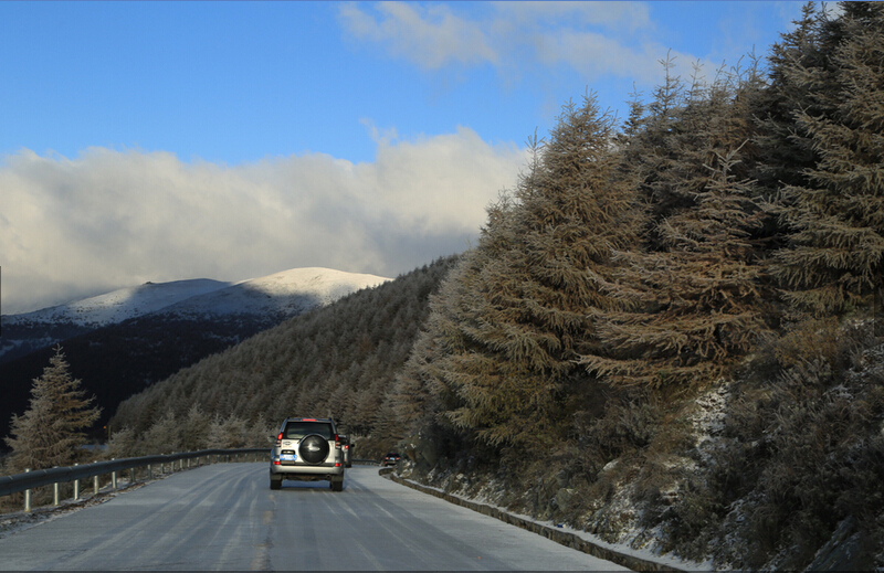 因五台山气温骤降,台顶已有积雪,为了保障来山游客的生命财产安全,杜绝交通安全事故的发生,经研究决定,从2015年10月1日零时起停止五座台顶旅游车辆的运行,明年视台顶道路状况再行开启。(刘永平 摄)
