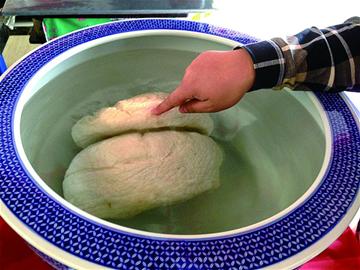 目前,这个太岁已被城阳这家俏红楼火锅店花50万元买下。昨天下午,记者赶至这家火锅店,在店门口看到了供养在瓷缸中的太岁。这个太岁由两个半球组成,30多斤重,就似上下相连的两块肥肉,摸上去像是一块肉团,美中不足的是被挖掘器的铲子挖出了两道伤口。记者电话联系上店老板得知,他平时就喜爱收藏,尤其是一些罕见的东西,这个太岁是经过专家鉴定的,目前他养在矿泉水中,每天都要更换水源,照顾得特别仔细。