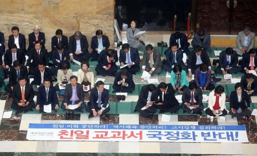 资料图片:韩国最大在野党新政治民主联合在国会大厅举行示威,要求政府撤回韩国史教科书国定化的决定