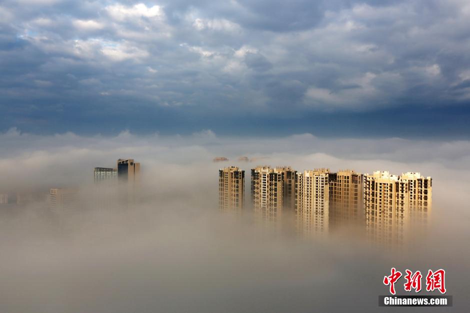 2015年11月7日,安徽黄山,雨后初霁,市区出现了蔚为壮观的云海美景,幢幢高楼耸立在云海间,江畔古村落若隐若现,宛如仙境,令人叹为观止。图片来源:视觉中国