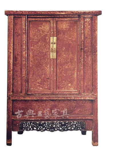 山西绛州一带漆家具,见有以红漆为地,上描金装饰,平面上多为山水人物,框架上多为锦地开光图案,绘制精细,高贵典雅,以柜橱类家具多见,往往只重正面,其他三面处理简陋,此器正是此类作品。这里举《大漆家具》书中所录红漆描金山水人物图柜为例(图1-2),可以一窥此类家具之风采。