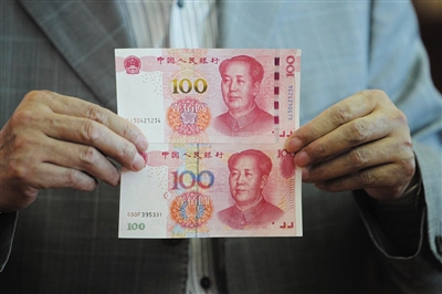 新华社北京11月12日电(记者刘铮)2015年版100元纸币12日开始逐步投放市场流通,票面新增的防伪特征光彩光变数字“100”和光变镂空开窗安全线非常显眼,方便公众识别并辨别真伪。