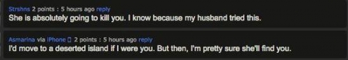 “我要是你我肯定会躲到无人岛上去。但是就算那样,我也相信她会找到你的。”网友 Asmarina 也跟帖表示。