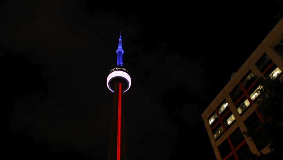 位于多伦多的加拿大国家电视塔亮起象征法国国旗的红白蓝三色,向法国表示支持。 中新社记者 徐长安 摄